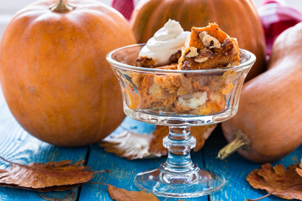 Warm bread pudding with pumpkin spice, caramel sauce, and whipped cream.